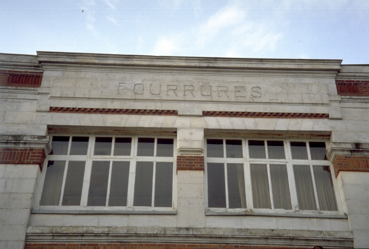 Détail des inscriptions portées sur la façade nord : Fourrures.Immatriculation