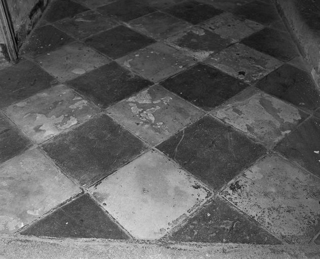 Escalier sud, détail du sol dallé (palier).Immatriculation
