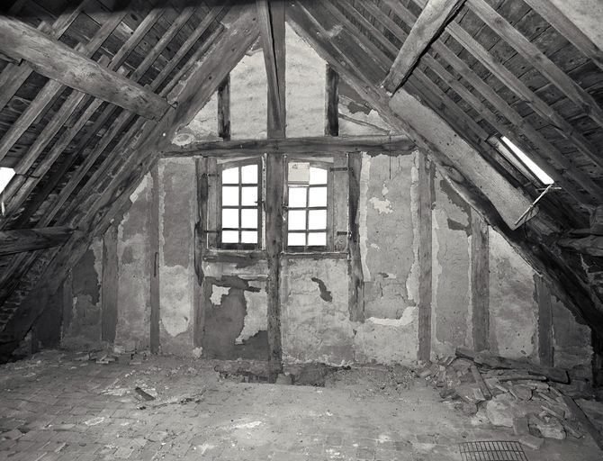 Comble, détail du pignon est à pan de bois.Immatriculation