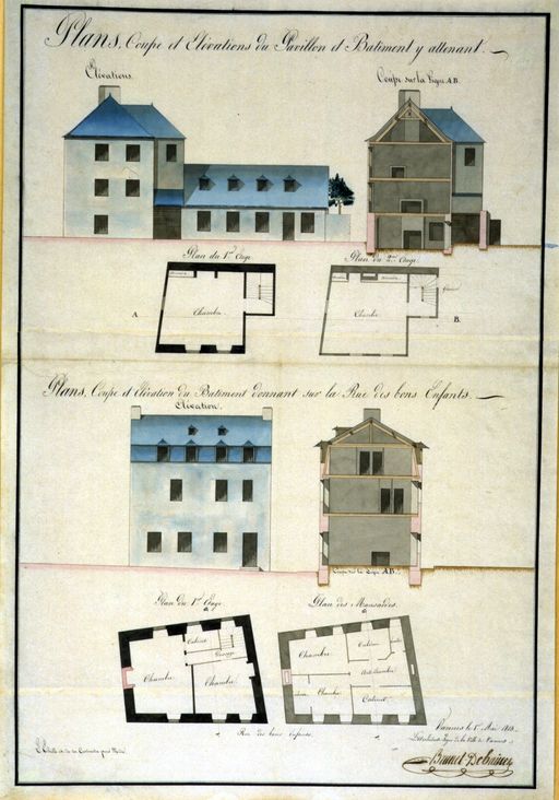 Ecole primaire de la rue des Bons Enfants. Plan et élévations par Brunet-Debaines, 1813. AM Vannes.Immatriculation