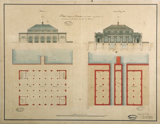 Plans, coupes et élévations d'une halle à grains, à construire sur le port de Vannes, par Brunet-Debaines, 1826. AM Vannes.Immatriculation