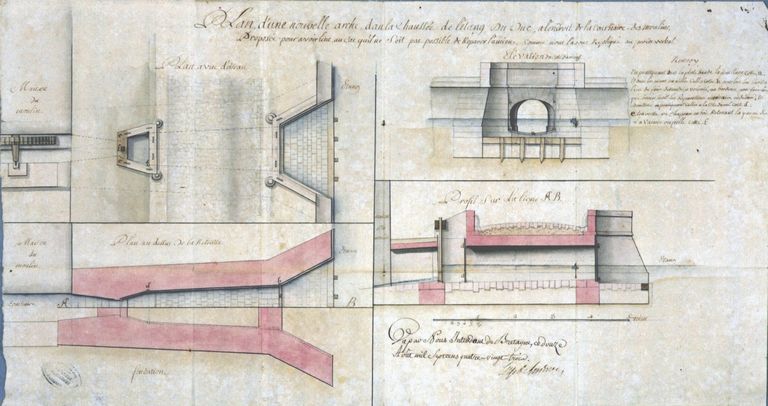 Plan, coupe et élévation d'une nouvelle arche dans la chaussée de l'étang au duc. 1783. AD Ille et Vilaine, C704/13.Immatriculation