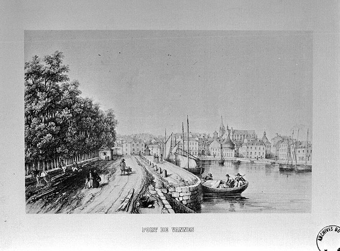 Dessin du 19e siècle. Vue du port et de la ville prise du sud. AD Morbihan 2Fi 508.Immatriculation