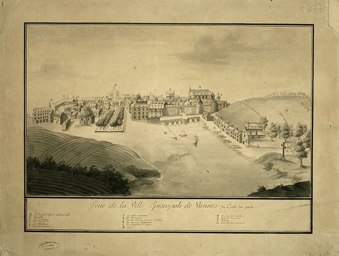 Vue de la ville de Vannes du costé du port, dessin de Robien, milieu 18e siècle. AD Morbihan 2Fi 477.Immatriculation