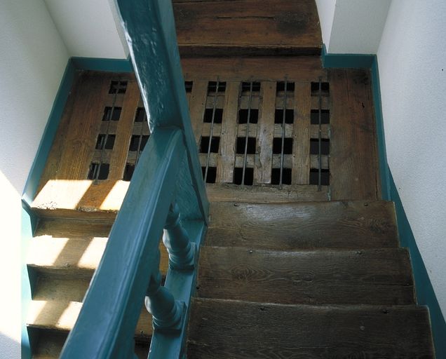 Escalier, palier du second : caillebotis en bois et fer.Immatriculation