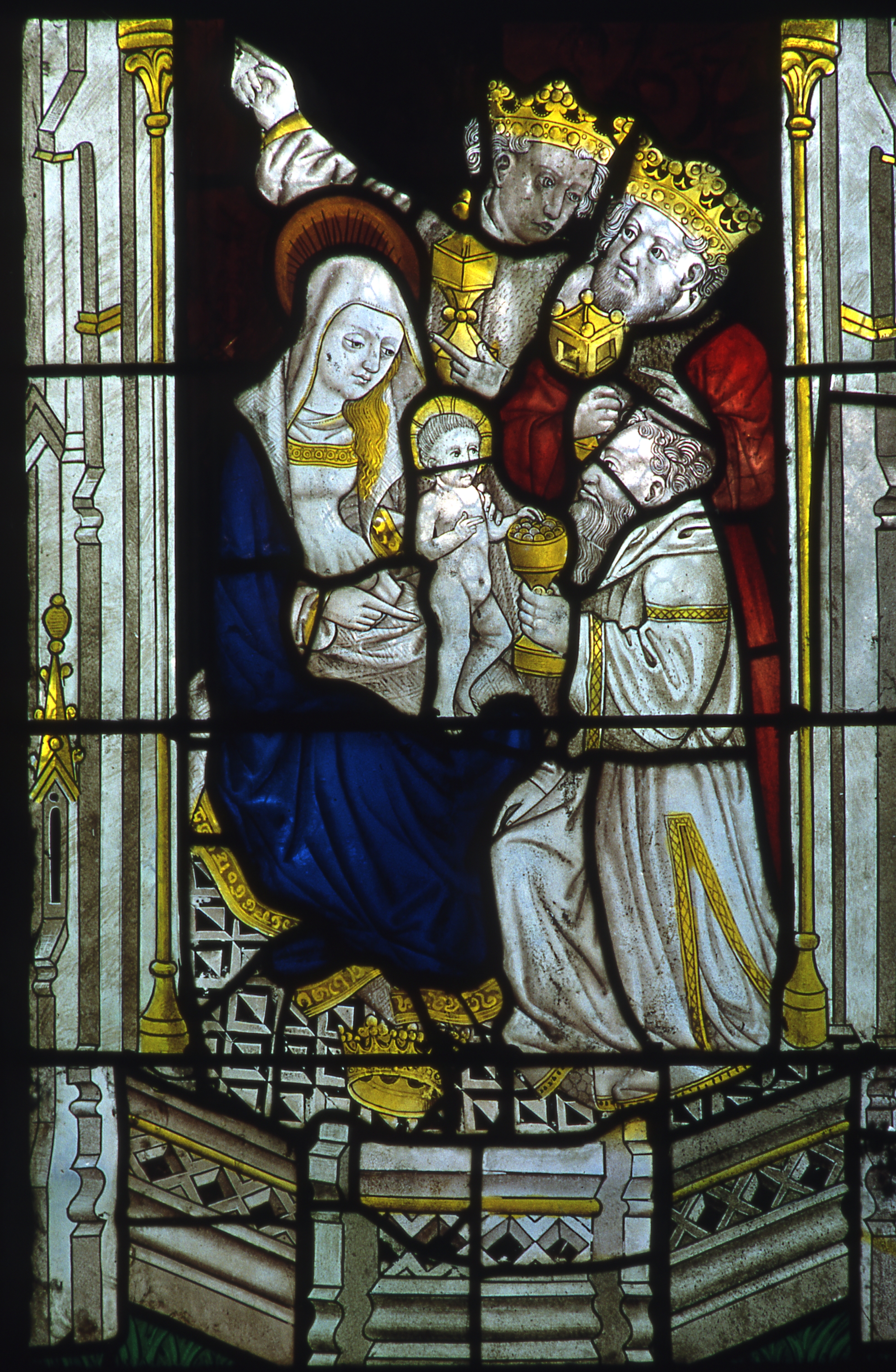 Ploubezre, chapelle de Kerfons : vue intérieure, détail de la maîtresse-vitre du chevet renfermant des panneaux anciens du 15e siècle. Remarquable scène de l'enfance du ChristImmatriculation