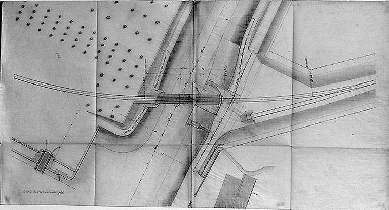 Redon. Projets d'embranchement pour le bassin à flots. Plan, par Clerc, [vers 1880]. Papier, encre, aquarelle ; échelle : 1 : 1000 et 1 : 200. (Archives privées SNCF : Rennes).