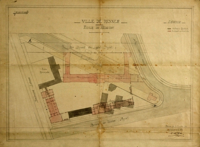 Villes de Rennes. École de médecine et de pharmacie. Plans du bâtiment à construire en 1897.Immatriculation