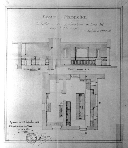 École de Médecine. Installation d'un laboratoire en sous-sol dans l'aile ouest : plan. Dessin, par Emmanuel Le Ray, 1919 (A.C.Rennes)Immatriculation