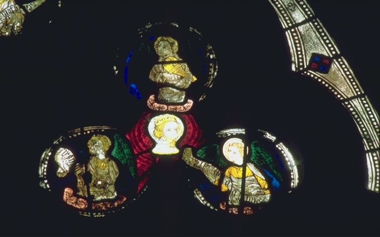 Verrière de la baie 8 (verrière décorative) : Le Christ et le tétramorphe, anges musiciens et portant des phylactères,