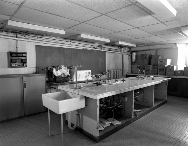 Intérieur : vue d'une salle de laboratoires (sous-sol).Immatriculation