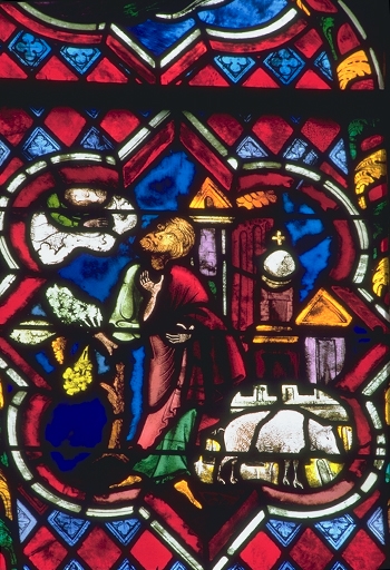 Verrière de la baie 100 (verrière légendaire) : Jugement dernier, Vie du Christ, Histoire d'Abraham, Vie de sainte Catherine, Vie de sainte Marguerite, évocation des évêques de Dol,