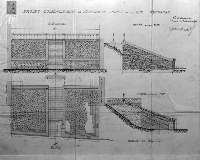 Projet d'aménagement de l'extrémité ouest de la rue d'Echange. Elévation et profils, dessin, 1912 (A. C. Rennes)Immatriculation