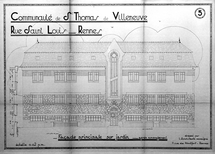 Communauté des Soeurs de Saint-Thomas de Villeneuve. Façade principale sur le jardin, dessin, par Frigault, 1934 (A. C. Rennes)Immatriculation