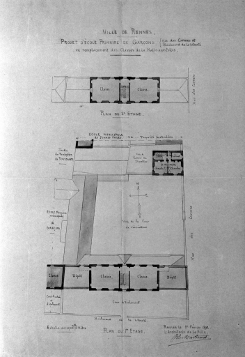 Projet d'école primaire de garçons, rue des Carmes en remplacement de la halle aux toiles, plans des 1er et 2e étages, dessin, par J.-B. Martenot, 01.02.1892 (AC Rennes : 2 Fi 963)Immatriculation