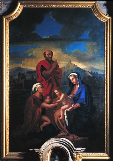 Tableau d'autel : La sainte Famille avec saint Jean, sainte Elisabeth et saint Joseph priant ; cadre,