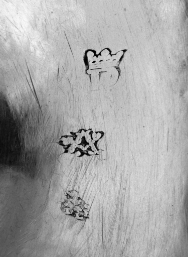 Détail des trois poinçons (poinçon de maître, poinçon de charge, lettre-date) sous le piedImmatriculation