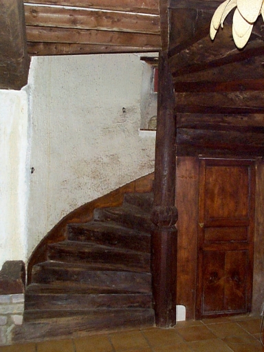 L'escalier en vis de bois, grande salle du rez-de-chaussée : vue généraleImmatriculation