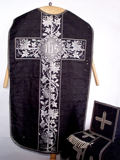Ornement noir 3 : chasuble, étole, manipule, bourse de corporal, voile de calice,