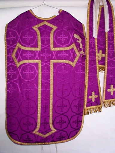 Ornement violet : chasuble, étole, manipule, voile de calice, bourse de corporal,