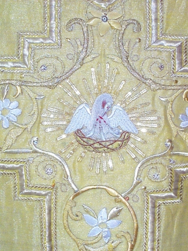 Ornement doré : chasuble, étole, bourse du corporal, voile du calice,