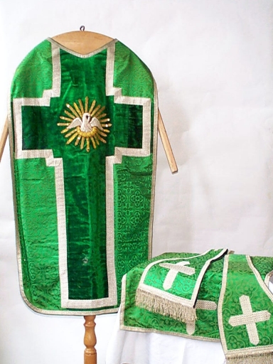 Ornement vert 2 : chasuble, manipule, étole, voile de calice (Campel fusionnée en Val d'Anast en 2017),