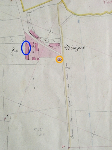 Le château sur le cadastre napoléonien : le corps de logis existant est cerclé d'une ellipse bleue et la chapelle disparue d'un cercle orangé.Immatriculation