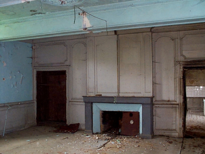 Grande salle au nord du vestibule d'entrée, décorée de boiseries du 18e siècle : vue partielle sud-ouestImmatriculation