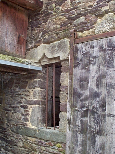 Linteau de grès délardé en accolade du 16e siècle remployé dans un logis transformé en étable : détailImmatriculation