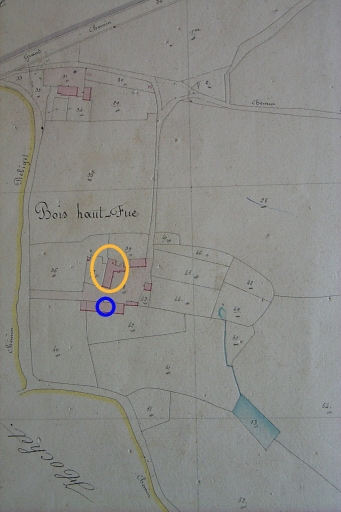 Le logis (cerclé en bleu), fermant la cour de l'ancien manoir (cerclé en orangé), sur le cadastre de 1830Immatriculation