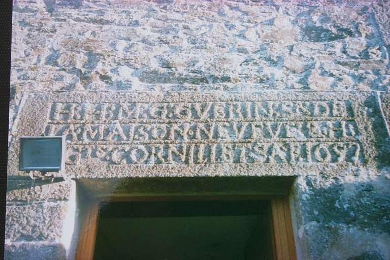Reproduction d'une photographie présentant, en lumière rasante, le linteau de la porte nordImmatriculation