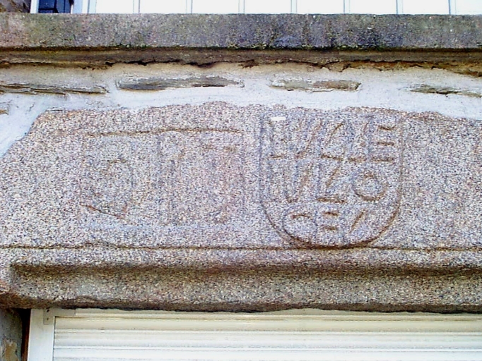 Rue du Bord de Mer, parcelle 467, un linteau du 16e siècle en remploi, présente à gauche les emblèmes d'un forgeron : le fer à cheval, la pince et le marteauImmatriculation