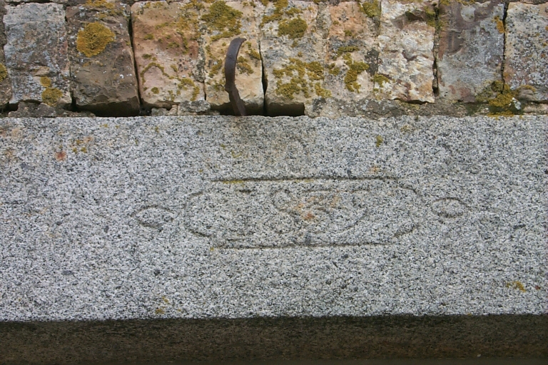 Linteau de la porte principale, date 1839 gravée dans un cartouche : détailImmatriculation