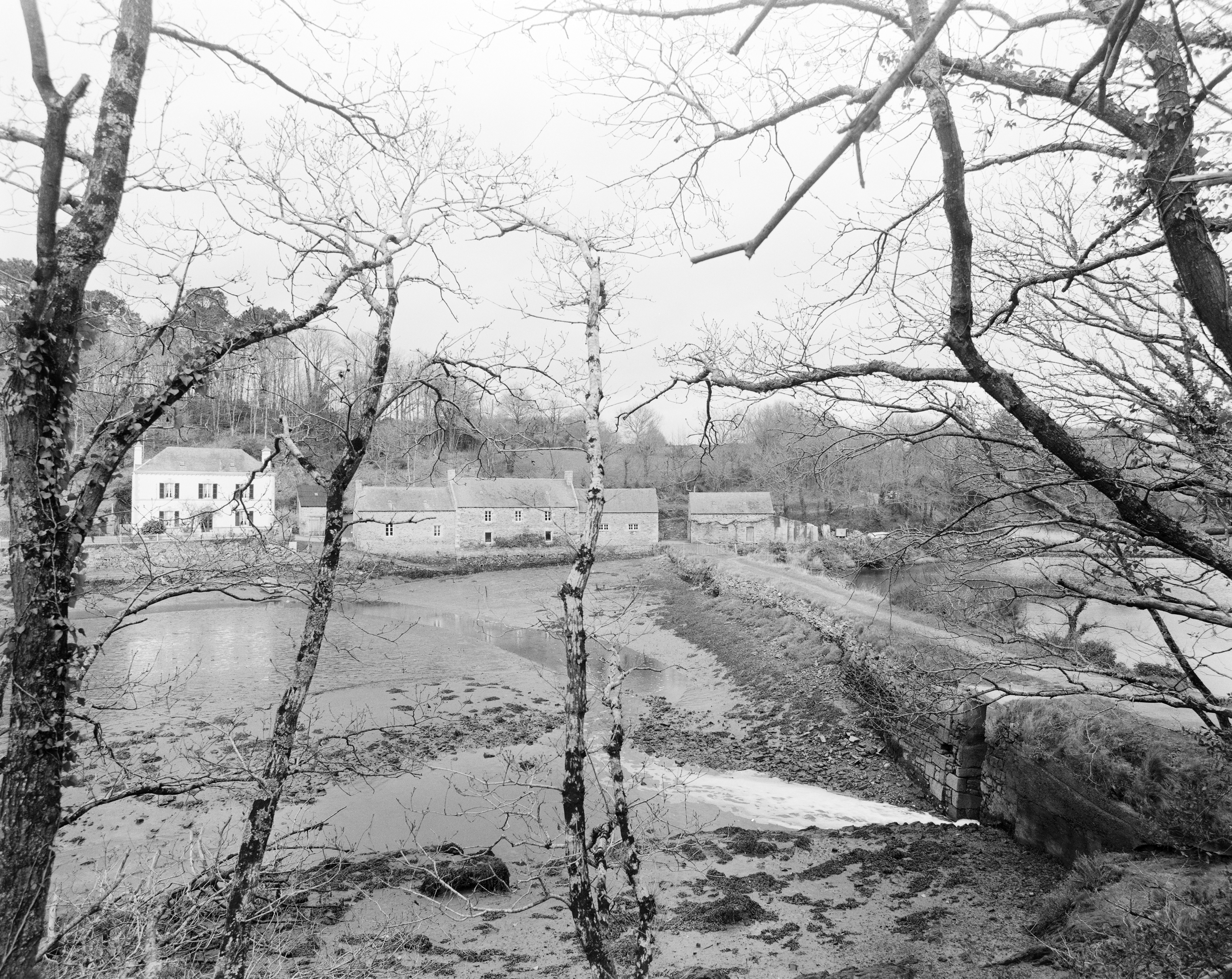 Vue générale de la digue avec l'étang, le moulin et la maison du meunier à marée basse.Immatriculation