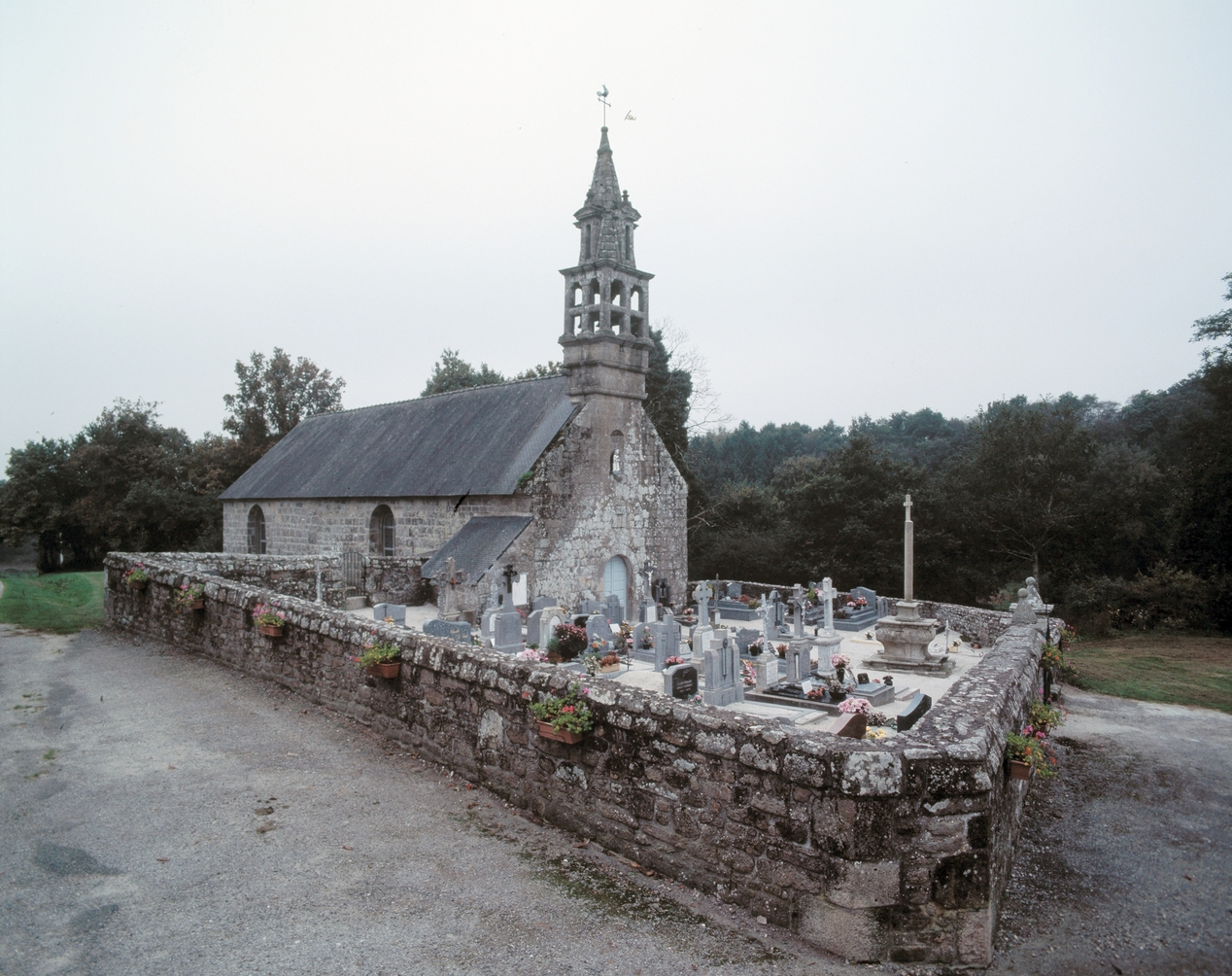 Vue générale du site avec la chapelle, son clocher, sa croix, son cimetière.Immatriculation