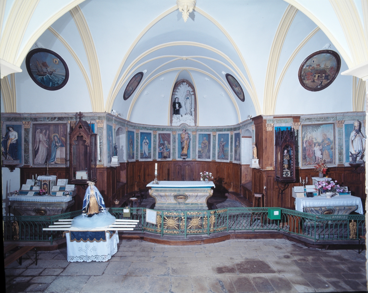 Vue générale du choeur avec lambris et la voûte.Immatriculation