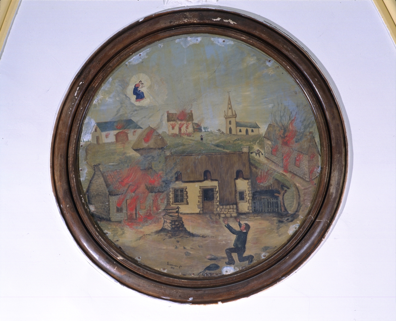 Ex-voto village en feu, détail, peint dans un médaillon circulaire : maison épargnée lors d'un incendie de village.Immatriculation