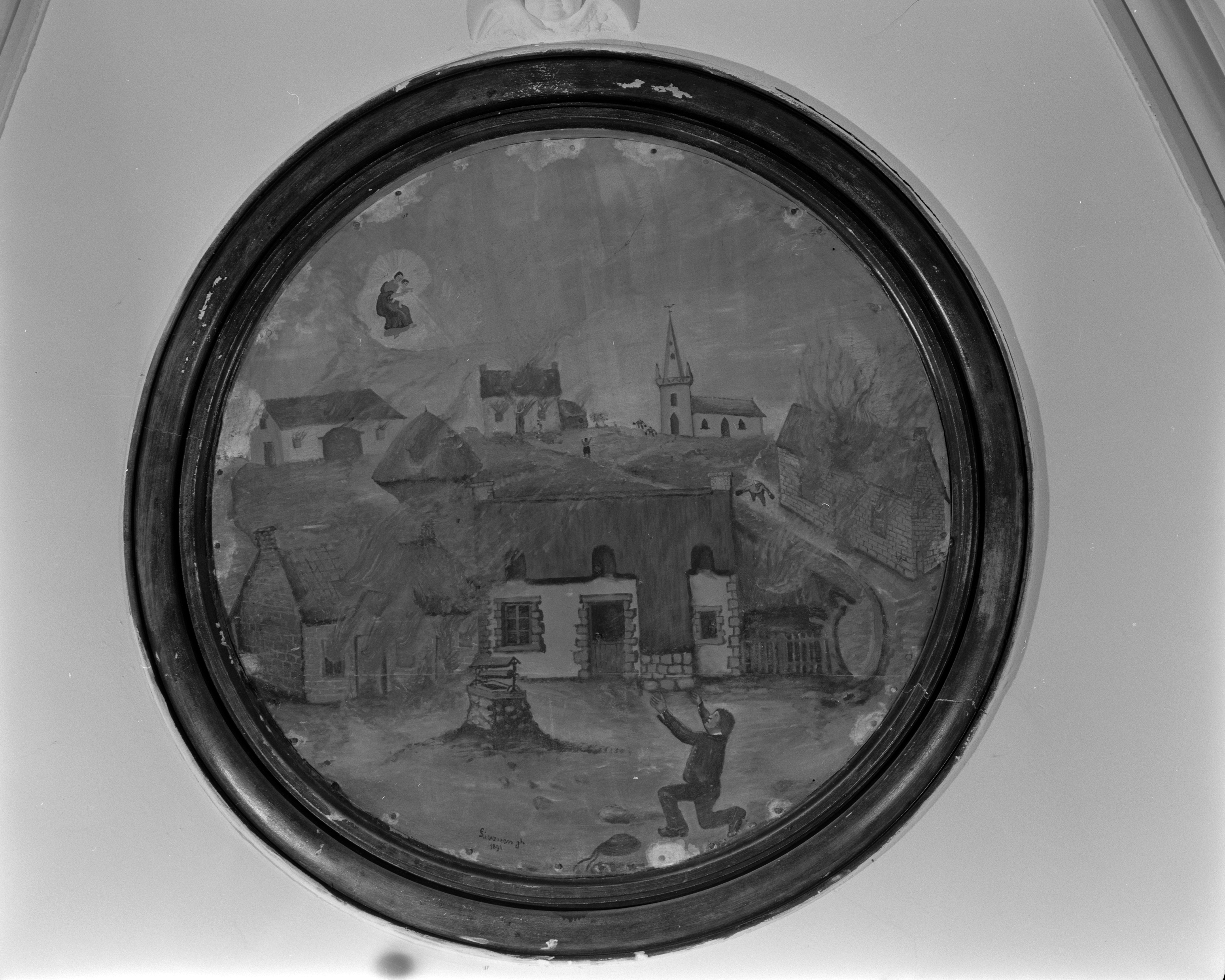 Ex-voto village en feu, détail, peint dans un médaillon circulaire : maison épargnée lors d'un incendie de village.Immatriculation