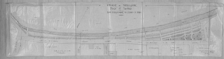 Commune de Perros-Guirrec, plage de Trestraou, plan d'alignement des cabines de bains, encre et lavis sur simili-calque, par Le Guyon, conducteur municipal, 19 déc. 1905.Immatriculation