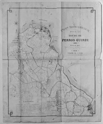 Plan régulateur pour le bourg de Perros-Guirec, non réalisé, tirage sur papier et lavis, par René et Raymond Danger, géomètres, 1925.Immatriculation