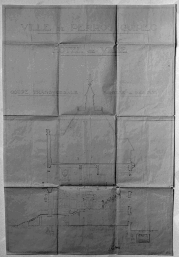 Hôtel de ville, Perros-Guirrec, coupe transversale, projet réalisé, tirage sur papier par Jean Le Corre, architecte, 25 novembre 1932.Immatriculation