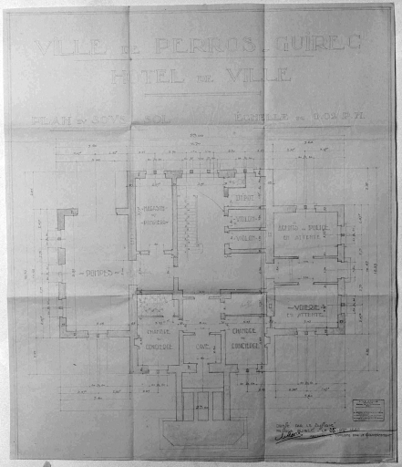 Hôtel de ville, Perros-Guirrec, plan du sous-sol, projet réalisé, tirage sur papier et lavis jaune par Jean Le Corre, architecte, 25 novembre 1932.Immatriculation