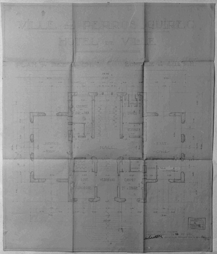 Hôtel de ville, Perros-Guirrec, plan du rez-de-chaussée, projet réalisé, tirage sur papier et lavis jaune par Jean Le Corre, architecte, 25 novembre 1932.Immatriculation