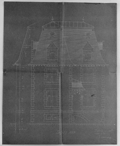 Façade sud, plan tiré sur papier bleu par Paul Courcoux, architecte, s.d.Immatriculation