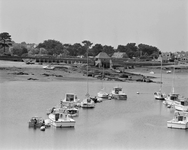 Moulin à marée de Trégastel et chaussée : vue depuis le port.Immatriculation