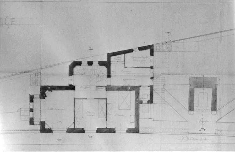 Propriété de M. Botrel, plage de Trestrignel, projet de villa réalisé, plan de l'étage, encre sur calque, par P. Botrel vers 1902Immatriculation