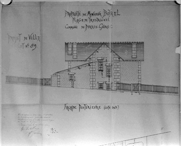 Propriété de M. Botrel, plage de Trestrignel, projet de villa réalisé, façade postérieure (côté sud), encre sur calque, par P. Botrel vers 1902Immatriculation
