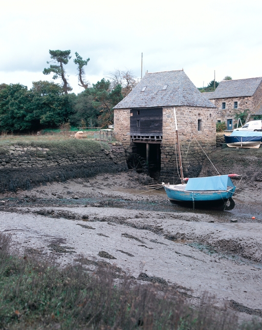 Moulin à marée de Traou Meur à Pleudaniel (édifice classé au titre des Monuments historiques en 1991), vue générale sud à marée basseImmatriculation