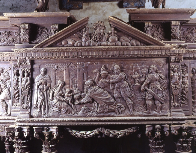 Partie centrale, panneau supérieur : Adoration des Rois Mages, vue généraleImmatriculation