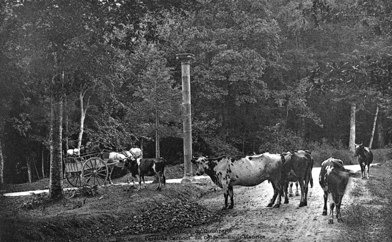 Colonne provenant de l'ancienne salle du château et remontée dans la forêt. Carte popstale, vers 1900 (A.D. Finistère, 1 Fi)Immatriculation